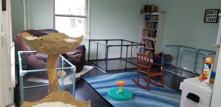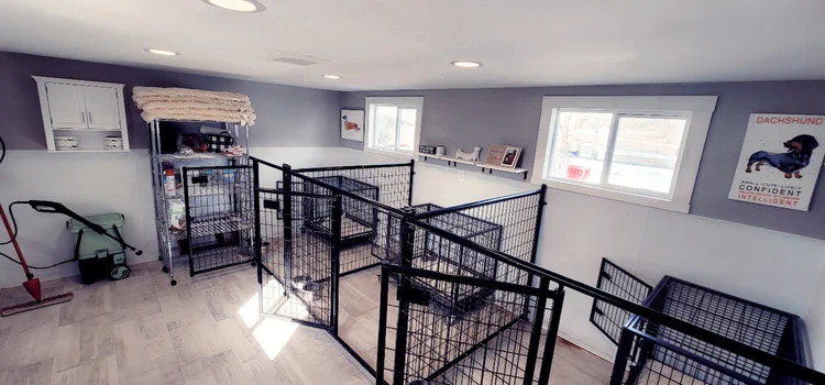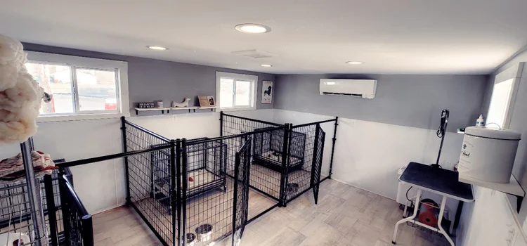 The suite features a grooming station, three built-in 5×5 ft pens with cozy raised beds, and ample storage for food, toys, and supplies. It’s temperature-controlled to keep them comfortable year-round and equipped with cameras so I can check on them whenever I’m away.