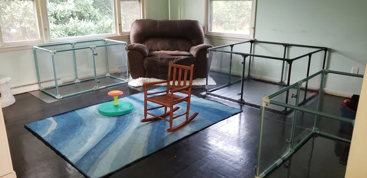 In this dedicated space, moms have privacy from the other adult dogs, helping them relax and focus on their babies’ well-being. It’s a calm and secure environment where they feel safe, yet it still allows the puppies to experience everyday household life.